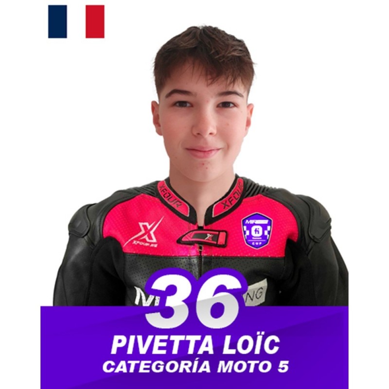 Pivetta Loïc es un piloto francés que continúa su carrera en el campeonato en la categoría Moto5 tras haber participado en 2024 ya en la misma categoría, donde terminó en la 22ª posición. Loïc hace su primera aparición en la MIR Racing Cup en la temporada 2023 donde pudo coger experiencia carrera tras carrera y evolucionar dentro de este gran deporte.