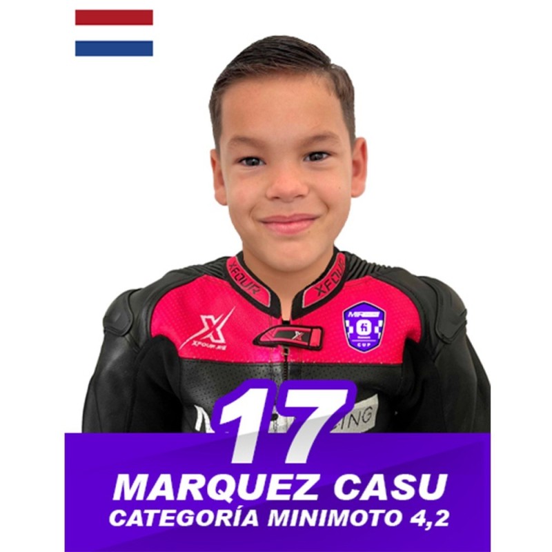 Marquez Casu, piloto holandés que inicia su segunda temporada en la categoría Minimoto tras haber terminado en una destacada 9ª posición en 2024. A lo largo de su primera temporada, Marquez demostró una gran competitividad y habilidad para mantenerse en el grupo de los mejores pilotos, superando los desafíos y aprendiendo de cada experiencia.