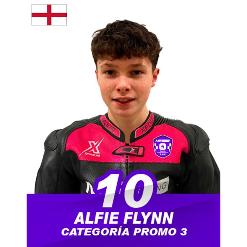 Alfie Flynn, joven piloto británico, continúa su trayectoria internacional dentro de la MIR Racing Cup dando el salto esta temporada a la categoría Promo3. Procedente de Inglaterra, Alfie ya tuvo su primera experiencia en el campeonato durante 2024, compitiendo en la categoría Moto5, donde finalizó en la 31ª posición de un total de 40 pilotos. Un año de aprendizaje intenso que le sirvió para adaptarse al formato del campeonato y a los exigentes circuitos españoles.