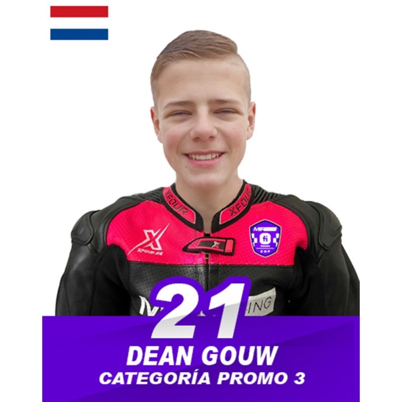 Dean Gouw es un piloto holandés que arranca su segunda temporada consecutiva en la categoría Promo3 de la MIR Racing Cup, con el objetivo de consolidarse como uno de los nombres fuertes de la parrilla. En 2024 firmó una destacada 12ª posición en la general tras un año de gran regularidad y adaptación al ritmo de una categoría altamente competitiva. Su trayectoria dentro del campeonato comenzó en 2023 en la categoría Moto5, donde ya demostró su talento al terminar en una excelente 6ª posición.
