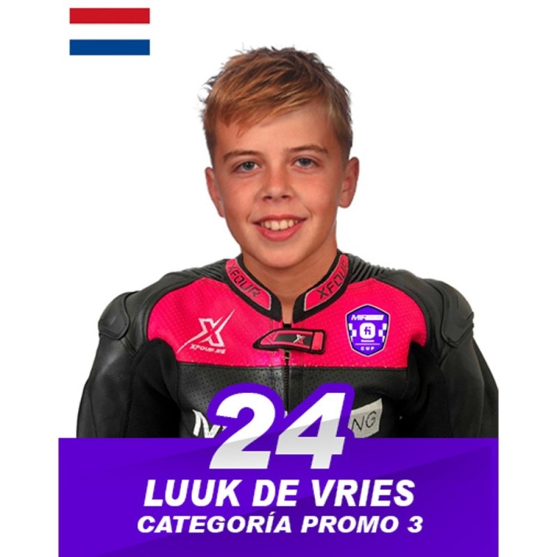 Luuk de Vries es piloto holandés que debuta esta temporada en la categoría Promo3 tras firmar una brillante actuación en Moto5 durante 2024, donde finalizó en una destacada 4ª posición en la clasificación general. Su regularidad, velocidad y capacidad para mantenerse siempre entre los pilotos punteros le permitieron cerrar el año como uno de los referentes de la categoría y uno de los talentos con mayor proyección del campeonato.