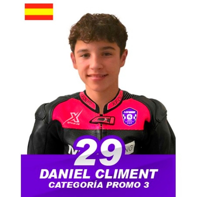 Daniel Climent es piloto valenciano que arranca su segunda temporada en la categoría Promo3 con la mirada puesta en lo más alto. En 2024 firmó una excelente 5ª posición en la general, consolidándose como uno de los pilotos más competitivos y regulares de la categoría. Su ascenso no ha sido casualidad: en 2023 se proclamó campeón de Moto5 tras una temporada brillante, demostrando una madurez y un nivel de pilotaje muy por encima de su edad.