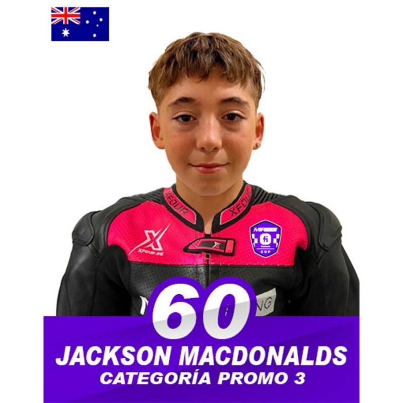 Jackson Macdonalds, piloto nacido en Australia que debuta esta temporada en la categoría Promo3 de la MIR Racing Cup tras un sólido paso por Moto5, donde en 2024 finalizó en una meritoria 12ª posición en la general. Un año antes, en 2023, ya había tenido sus primeros contactos con el campeonato al participar como wildcard en varias pruebas de Moto5, mostrando desde el inicio una fuerte proyección y gran adaptación al formato de competición.